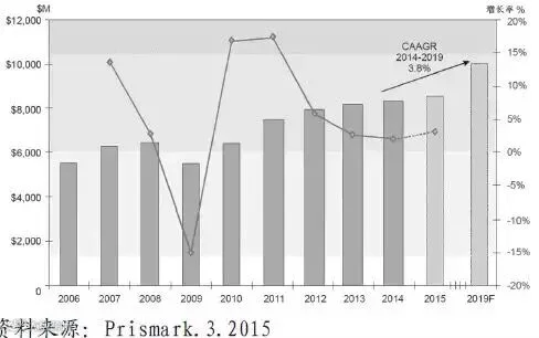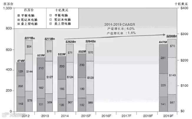根据prismark在2015年3月的统计,2014年全球平板电脑产量2.20亿台,比2013年的2.10亿台增长4.5%。而且预测未来增长幅度平稳,但增长率不大。而2014年全球平板电脑产值增长率已成负数,见图3。
