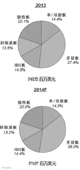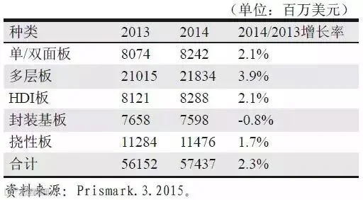 增幅最大的是多层板,增幅最小的是封装基板,2014年所有PCB种类产值变化不大,见图5。