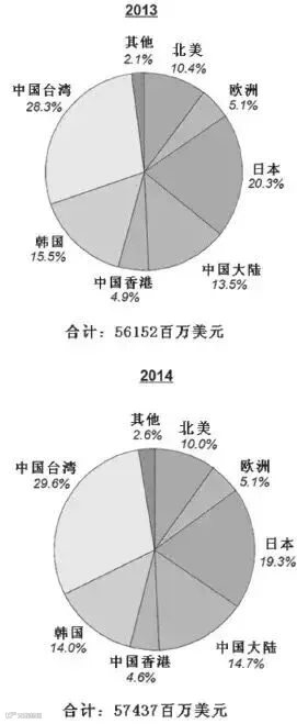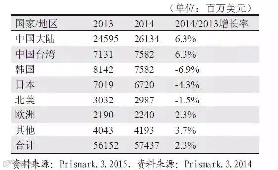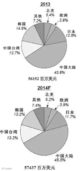 相对于2013年而言,2014年中国大陆PCB产值的增长率为6.3%,中国台湾PCB产值的增长率为6.3%,韩国由于三星销量影响产业链,PCB境况不如之前乐观,韩国PCB产值的增长率为-6.9%。由于2014年日元贬值,日本的PCB产值的增长率为-4.3%,日本PCB行业的产量产值还将持续下降,亚洲其他PCB产值的增长率为3.7%,尽管日韩业者积极投资东南亚,但在中国大陆厂商的崛起之下,东南亚产业配套仍相对不是很完善,且中国内需市场及终端品牌不容忽视。欧洲的PCB产值增长率为2.3%,北美PCB产值的增长率-1.5%。