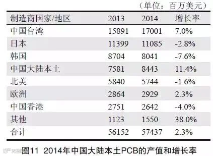 近年来,中国大陆本土PCB一直稳步发展,在全球PCB领域的影响越来越大,由2013年的75.81亿美元,增加到2014年的84.43亿美元,增长率为11.4%,见图11。