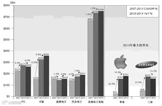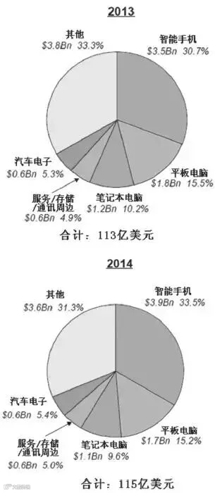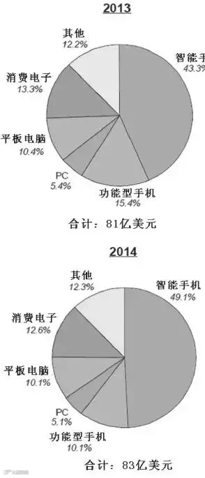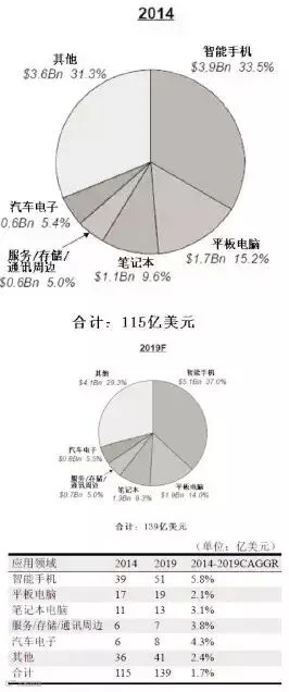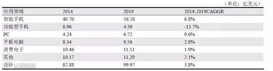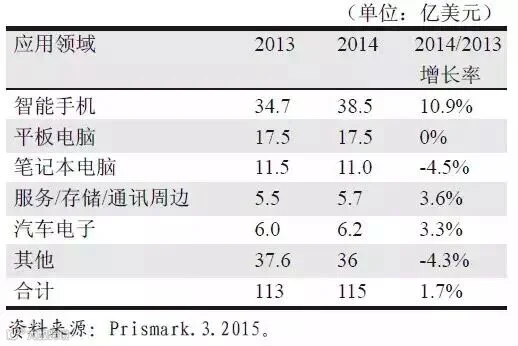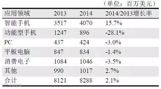 预测终端应用部分,PC端将持续稳定;智能终端仍然会增长,但力度不如前几年,2014年平板就增长停滞,苹果平板甚至出货下滑,而市场容量及竞争者加入,这部分的增长必定会放缓。