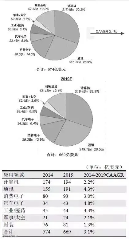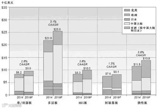 预测2014年~2019年,汽车电子用PCB的CAAGR将增长4.8%。工业/医药用PCB的CAAGR将增长4.4%,通讯用PCB的CAAGR将增长4.4%,见图16。