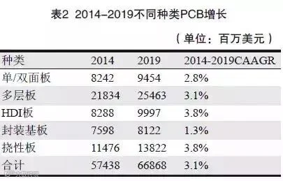 预测未来5年,亚洲将进一步成为全球PCB的主产区,挠性板和HDI板继续保持优先的复合增长率,其他品种线路板也有较小的增长。见图15和表2。
