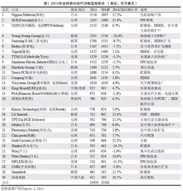 日本FPC大厂旗胜再次蝉联全球第一,2014年产值(包括装配产值)接近30亿美元,增长17.2%,台湾臻鼎名列第二,全球前30名产值333.61亿美元,占了58%。可喜的是,我国深南电路第一次进入全球前30名,标志着中国大陆本土PCB在快速发展,见表1。