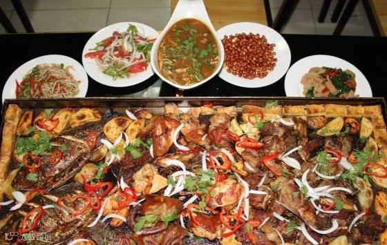 海陆空烧烤:来自新疆的特色烧烤美食,选用鱼肉、羊肉、鸡肉,配合新鲜时蔬混合烤制而成,种类丰富,味道优美,盛用器具壮观,如同航空母舰,被称为 “新疆最猛的烧烤”。烧烤行业之终极之烤!