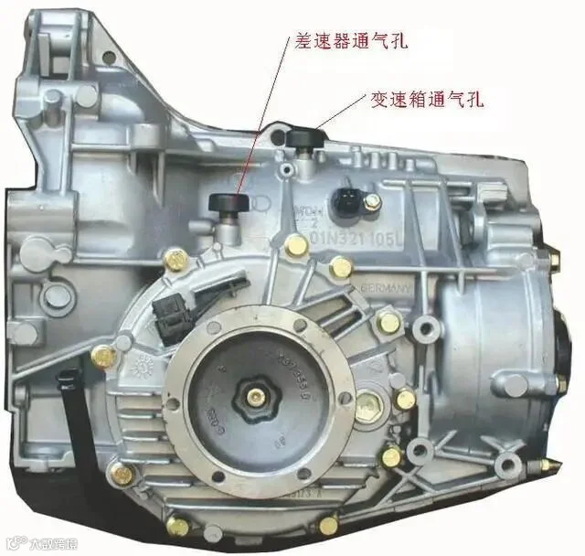 所以任何变速器都不是密封的、都预留好了通气孔用来散热、平衡气压,而且通气孔还不仅仅是一个,不同品牌变速器的通气孔位置也完全不同;如上图所示、某品牌的变速器,咱们从图上直接就能看到差速器通气孔以及变速器通气孔,而实际上还应该存在第三个通气孔,那就是在机电部分的控制单元位置上也会有一个通气孔,只不过这个通气孔往往布置在高位、保护的不错,即便经常涉水也很难渗入!