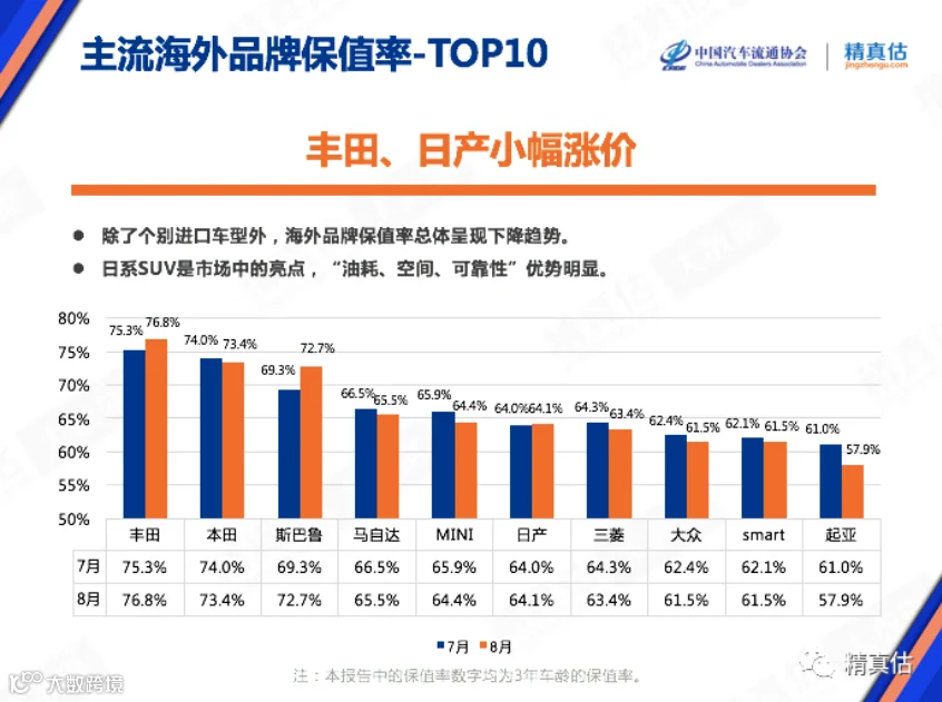 在海外品牌保值率排名中,日系三剑客丰田、本田和日产分别排名第一、第二和第六。其中丰田三年保值率为76.8%,旗下普拉多和汉兰达车型保值率较高,普拉多三年保值率为82.22%,而汉兰达则为80.37%,遥遥领先其它日系车型。当然,TOP10也出现了一些小众品牌,比如MINI和smart,由于个性化的特点受到粉丝追捧。