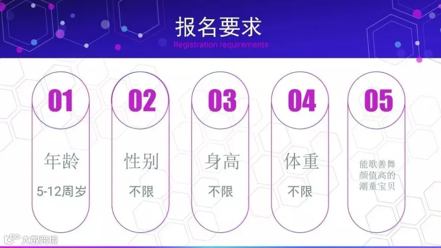 1、选手要求:年龄:5-12周岁,性别:不限,身高:不限,体重:不限。