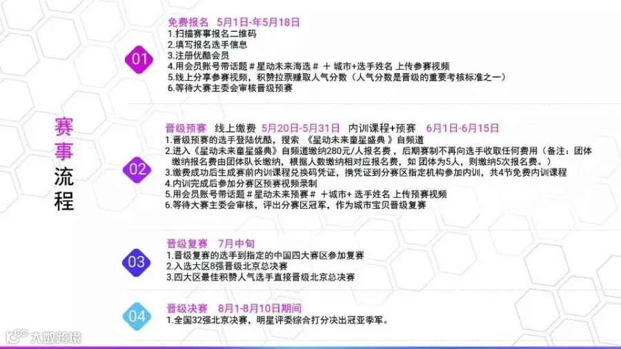 赛事分成全国华中、华南、华北、华东4大赛区,50000名童星宝贝共襄盛事,优酷近6亿日点击量和4亿视频用户平台全程深度聚焦,一线明星亲临决赛现场坐阵嘉宾席……万众瞩目,只为找到人群中最耀眼的你!