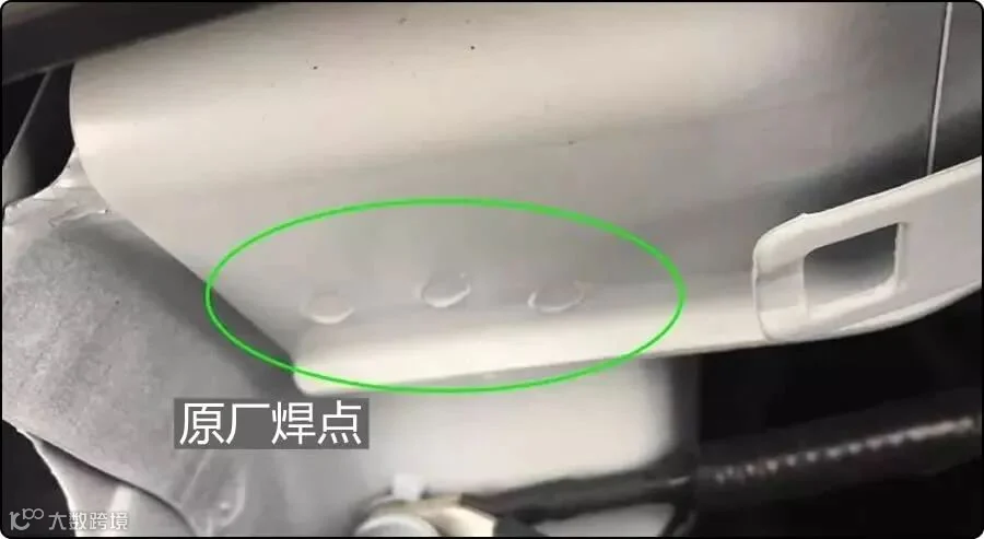 如果是焊点连接,观察水箱框架和翼子板上纵梁结合部分的焊接点。原厂焊点应略呈真圆及略微凹陷。若是发现焊点呈凸出状,有失圆或大小不一的点焊,焊点粗糙不光滑,排列不规则、不均匀,则表明是重新烧焊的痕迹,水箱框架受过撞击。