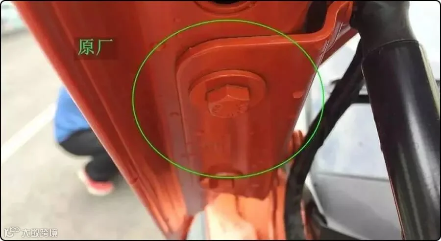 如果说这辆车拆卸过又重新上漆了怎么办呢?那就可以对比螺丝和它周围的漆面是否有色差,你想想现在有些4S店喷的漆都可能略有色差,更别说那些没有正规厂家培训的修理厂了。