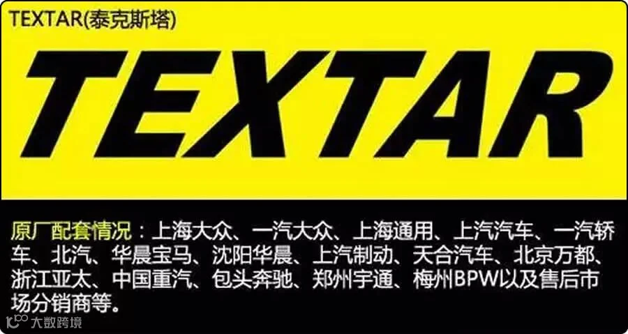 TEXTAR(泰克斯塔)为泰明顿旗下品牌之一。德国泰明顿(TMD)摩擦村料集团成立于1913年,是欧洲最大的OE供应商之一。泰明顿中国目前客户有上海大众、一汽大众、上海通用、上汽汽车、一汽轿车、北汽、华晨宝马、沈阳华晨、上汽制动、天合汽车、北京万都、浙江亚太、中国重汽、包头奔驰、郑州宇通、梅州BPW以及售后市场分销商等。