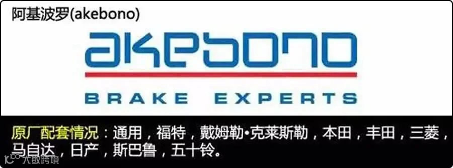 阿基波罗(akebono),日本顶级的刹车片制造厂家,三菱、日产指定配套,为通用、福特、丰田、尼桑等集团提供制动产品。阿基波罗的OEM客户包括:通用,福特,戴姆勒•克莱斯勒,本田,丰田,三菱,马自达,日产,斯巴鲁,五十铃等。