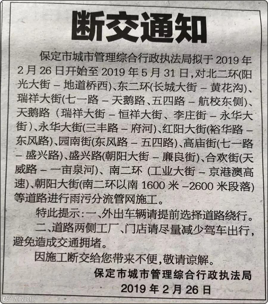 保定市城市管理综合行政执法局拟于2019年2月26日开始至2019年5月31日,对北二环(阳光大街一地道桥西)、东二环(长城大街一黄花沟)、瑞祥大街(七一路一天鹅路、五四路一航校东侧)、天鹅路(瑞祥大街一恒祥大街、李庄街永华大街)、永华大街(三丰路一府河)、红阳大街(裕华路一东风路)、园南街(东风路一五四路)、高庙街(七一路一盛兴路)、盛兴路(朝阳大街一廉良街)、合欢街(天威路-一亩泉河)、南二环(工业大街一京港澳高速)、朝阳大街(南二环以南1600米-2600米段落)等道路进行雨污分流管网施工。
