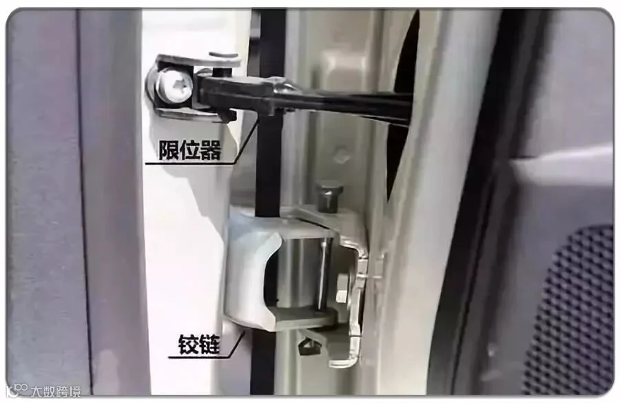 车门和车身通过铰链和限位器连接在一起,前者是固定作用,后者限制车门的打开角度。