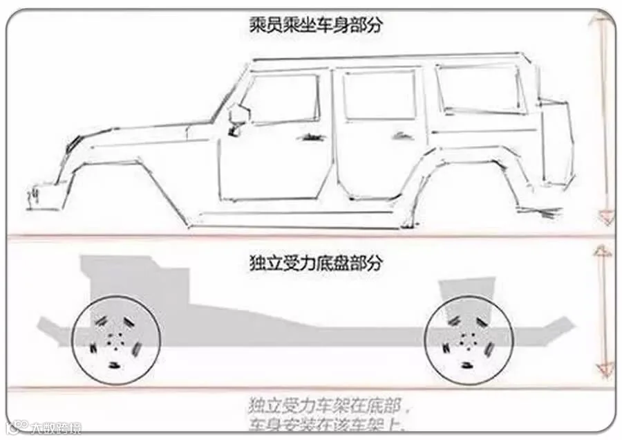 硬汉的形象通常是浑身肌肉给人充满力量的感觉,硬派越野车都会采用非承载式车身。简单来说,非承载车身是有刚性车架,又称底盘大梁架。