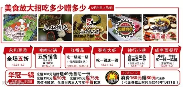 洋葱花西餐自助烤肉、巫山烤鱼、玉林串串香、红番茄、友情客串、金玲珑别墅主题餐厅,在2015.12.31—2016.1.2自助餐类返还自助餐券,非自助餐类按消费金额返还同等金额的现金券。