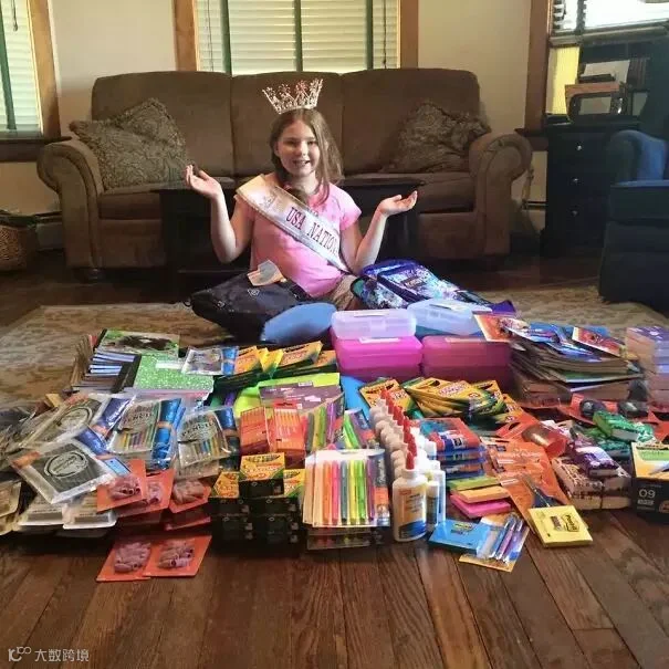 Mackenzie用两次义卖得到的500美金买了很多文具给那些需要文具的小朋友。▼▼
