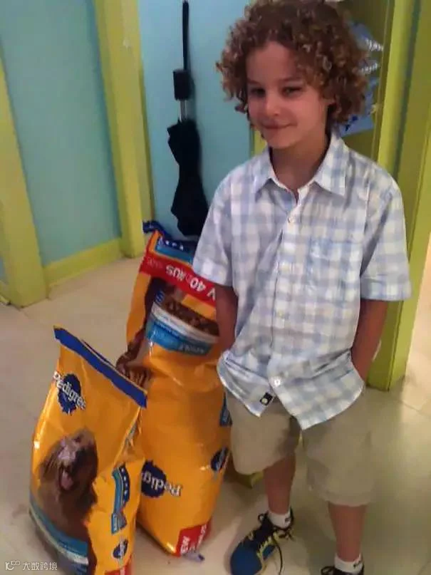 小男孩用自己的零花钱买狗粮送给当地的动物庇护所。▼▼