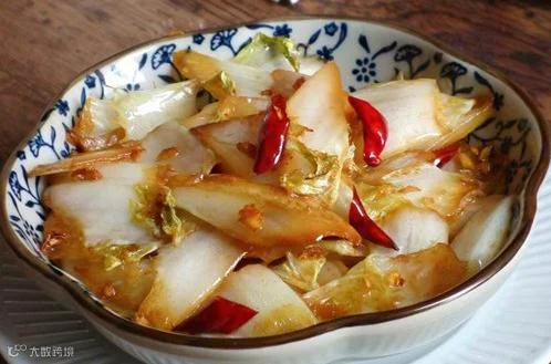2)炒锅加菜油,烧成7成热,下撕碎的干辣椒,炒至略微发焦,放入姜末和白菜,油稍微大一点把白菜煎一下,很香。