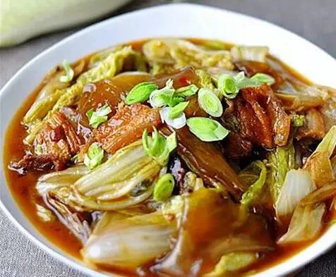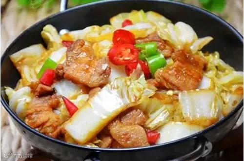 大白菜400g、五花肉100g、葱花适量、红辣椒20g、青辣椒30g、老抽20ml、蚝油15g、白糖2g、盐适量、黄酒10ml、鸡精少许。