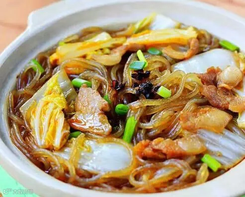 2)把粉条用热水泡软洗净,过凉水捞起;