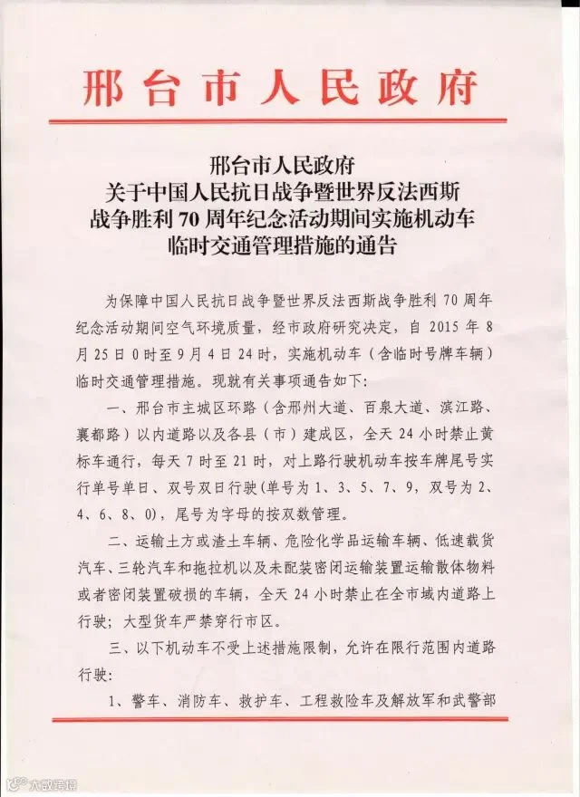 为保障中国人民抗日战争暨世界反法西斯战争胜利70周年纪念活动期间空气环境质量,经市政府研究决定,自2015年8月25日0时至9月4日24时,实施机动车(含临时号牌车辆)临时交通管理措施。