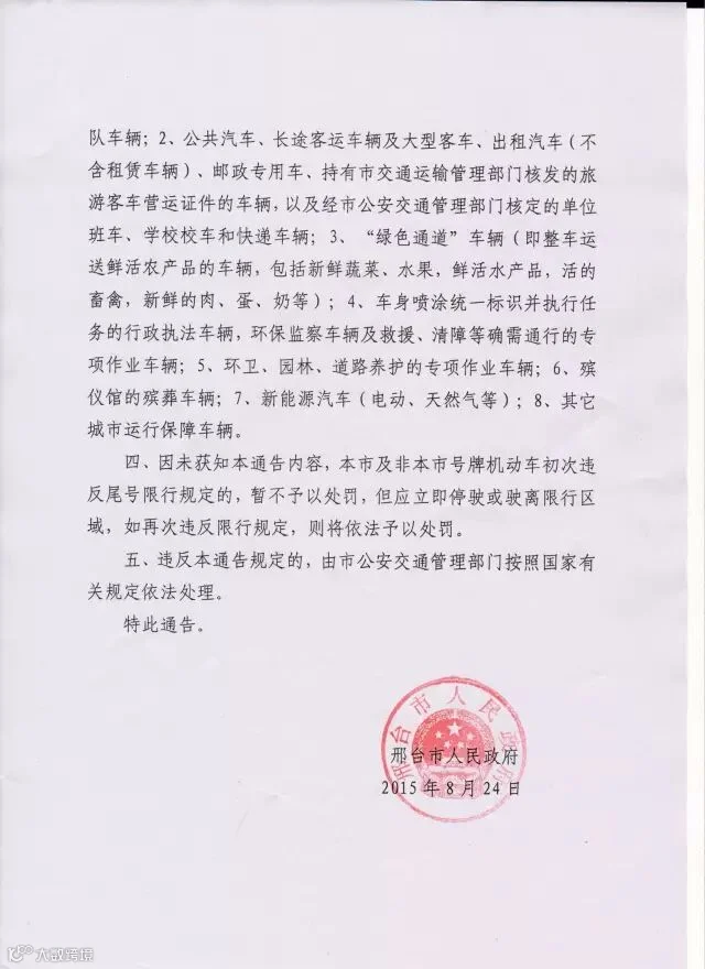 邢台市主城区环路(含邢州大道、百泉大道、滨江路、襄都路)以内道路以及各县(市)建成区,全天24小时禁止黄标车通行,每天7时至21时,对上路行驶机动车按车牌尾号实行单号单日、双号双日行驶(单号为1、3、5、7、9,双号为2、4、6、8、0),尾号为字母的按双数管理。