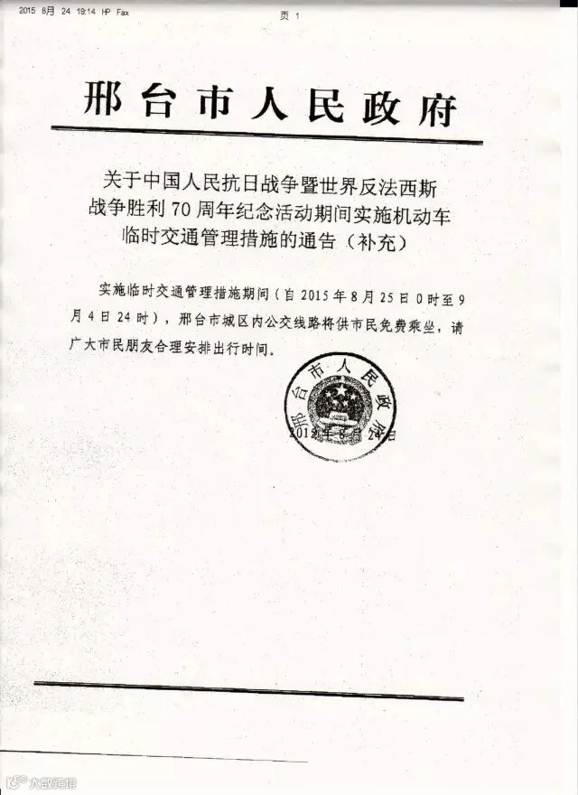 实施临时交通管理措施期间(自2015年8月25日0时至9月4日24时),邢台市城区内公交线路将供市民免费乘坐,请广大市民朋友合理安排出行时间。
