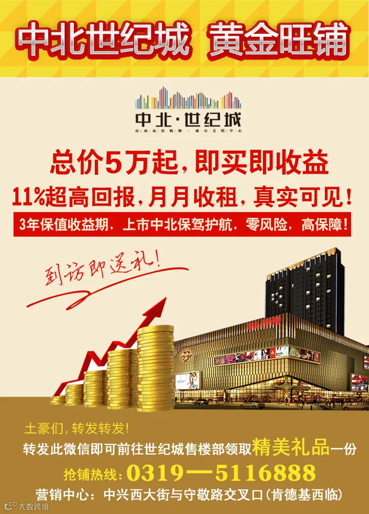 世纪城黄金旺铺,总价5万起,即买即收益,11%超高回报,月月收租,真实可见! 3年保值收益期,上市中北保驾护航,零风险,高保障!到访即送礼,抢铺热线:5116888,地址:世纪城购物中心北门西侧。