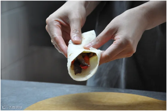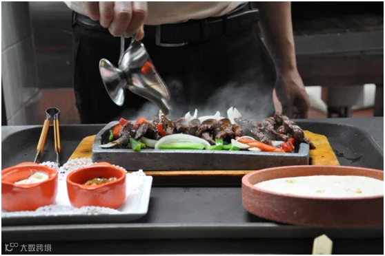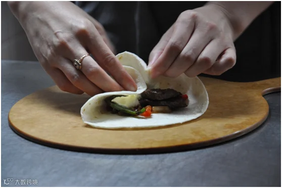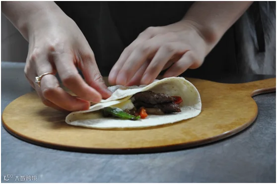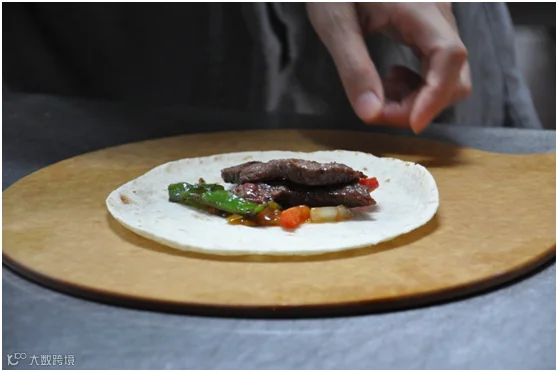 你的面前有一盒多提亚饼(Tortilla),一石盘烤好的牛肉,打底的是洋葱、青椒、红椒等蔬菜,有一盏神灯形状的黑椒汁,还有两小罐可爱的酱汁,乳白色的是酸奶酱,红彤彤的是莎莎酱。