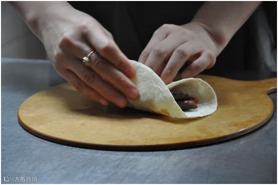 然后,在一块Tortilla多提亚饼上涂抹酱汁。酸奶酱和莎莎酱都是后厨的哥哥姐姐每天新鲜制作,据说莎莎酱里面的青泡椒还是从墨西哥进口的,顿时感觉好酸爽。