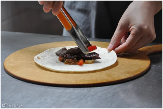先把神灯里的黑椒汁淋在牛肉上。千万当心看似安静的石头烤盘,一两百度的高温蓄积在它体内,遇到油分水分会一下子沸腾起来。这时你需要勇敢地拿起夹子快速翻炒,让浓郁的黑椒汁包裹住切成条状的进口牛肉、以及蔬菜。保证Fajita馅料味道均匀,就看这一下咯!