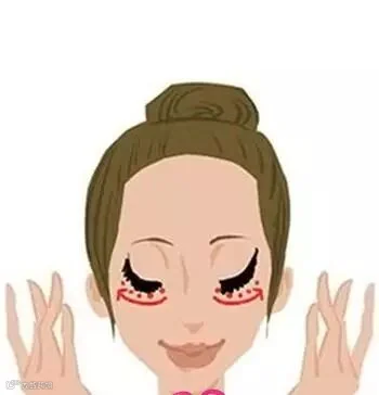 先取适量眼霜在无名指,根据眼霜的质地来控制分量。轻轻匀开后用无名指按照箭头方向轻点在眼睛周围的皮肤上,注意每个点的位置眼霜的分量要尽量平均,眼角等重点位置更不可遗漏。