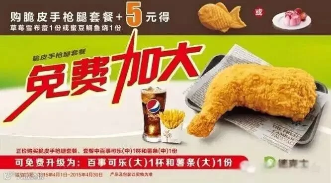 ●活动时间:4月1日-30日●优惠可同时享受:1.购脆皮手枪腿套餐免费升级(中薯条升级为大薯条、中可乐升级为大可乐或任意口味茶冻奶茶一杯)2.购脆皮手枪腿套餐可享草莓雪布蕾或蜜豆鲷鱼烧5元一份