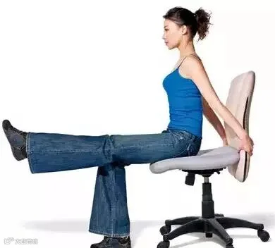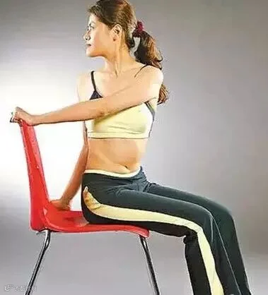 不要把整个屁股都坐在椅子上,只要坐到椅子的1/2处就可以了,然后以基本的坐姿做好,腰背挺直,右手置于椅背,左手置于右椅侧,上半身向左扭转。做完之后,然后换手做同样的动作。重复做上五次即可。这个椅上转身的动作可以帮助有小肚子的人减掉这个地方的赘肉,在转动的过程中还能缓和颈肩及背部酸痛。