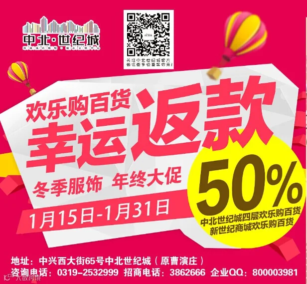 传播邢台流行时尚,会员相关网络活动互动,中北集团旗下的中北商贸所属商业:中北商贸、中北商城、新世纪商城、世纪城购物中心、欢乐购百货等相关品牌和商品促销宣传及公益服务。