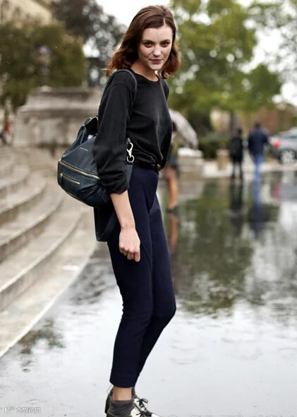 休闲装扮搭配何以穿出新意?平淡宽松的衣衫容易让穿着者了无生趣,一条简单的高腰紧身裤的加入似乎一下 子就解决了全部难题,再将裤脚微微卷起显示随性气质,金色拼接布洛克鞋细节处展示英伦气质。