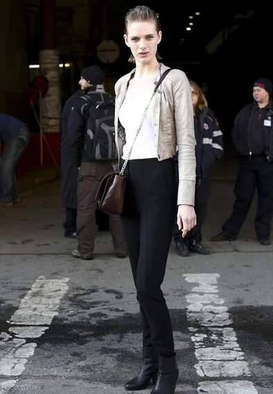 帅气干练的中性着装组合,黑色高腰裤装搭配白色T恤,外穿浅茶色机车夹克。虽然着装搭配硬朗有余,却因 修身款式的配搭勾勒出身材曲线,避免过于男性化。