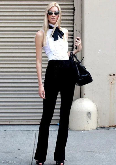 白衬衫黑西裤本是职场女性最基本的穿搭配置。若稍加变化即不失为时尚之选,衬衫前襟加之荷叶边造型装饰 ,一条系成蝴蝶结样式的领巾点缀在领口位置,裤装将腰线上移最后配搭一双黑底高跟鞋。