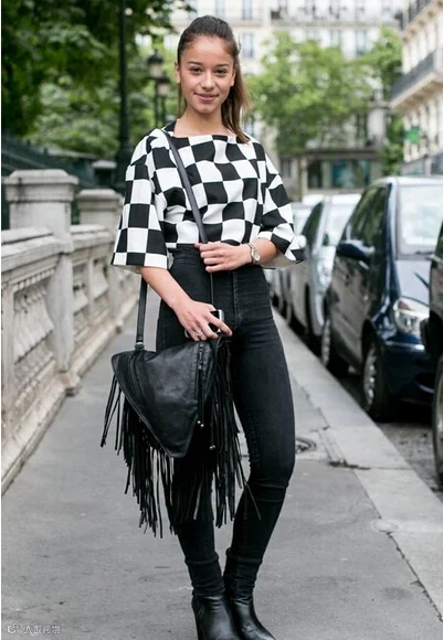 宽松款式黑色棋盘格印花上装,搭配高腰紧身黑色牛仔裤,上款下窄的组合搭配让着装张弛有度。单肩流苏挎 包在行走中增加律动感,成为初夏街头一道靓丽的风景线。