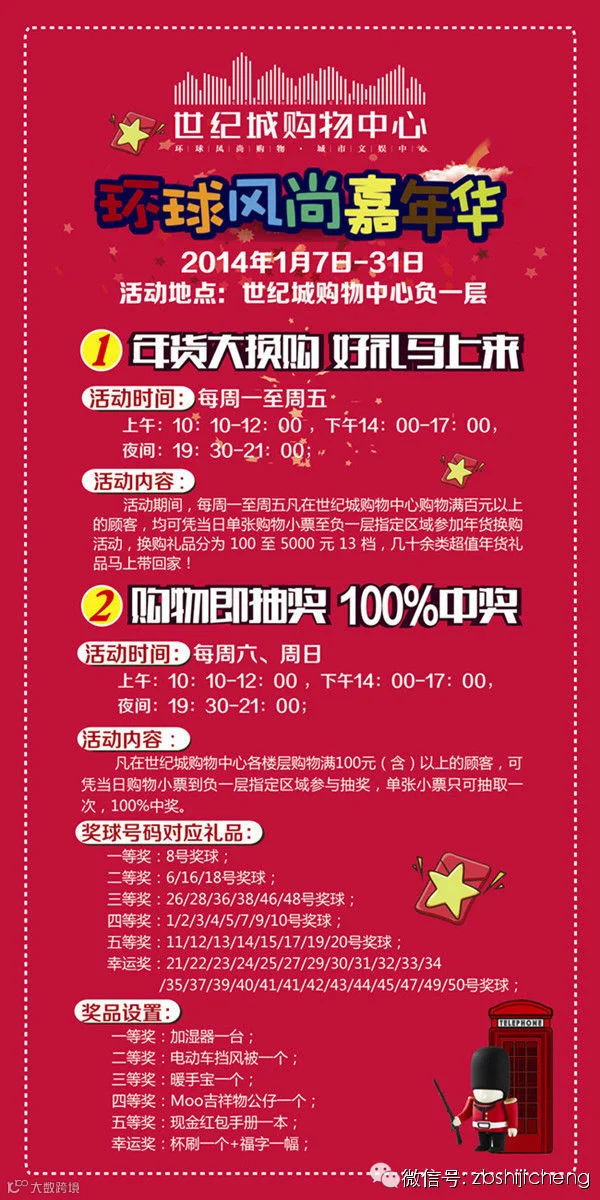 2014年1月31日之前,世纪城购物中心狂欢优惠大派送:购物即抽奖,让您100%中奖;关注微信或者消费换取抽奖券,即可参加我们的抽取汽车大奖的活动;只要您消费满100(含100元)还能参与“年货大换购”活动!礼品包括汽车、自行车、加湿器、现金红包手册……让您喜庆过大年!