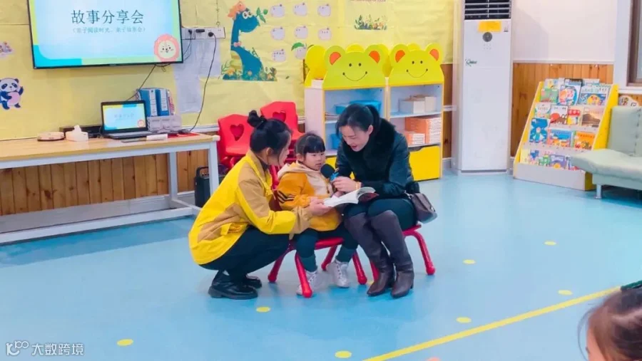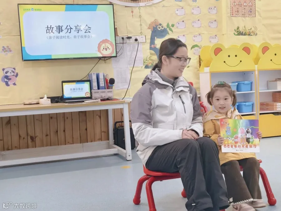 最让人期待的故事分享会来啦!首先是温馨的亲子阅读时光,爸爸妈妈们和宝贝们紧紧靠在一起,跟着老师的带领,共同阅读幼儿用书上的精彩故事。温柔的话语、亲密的依偎,构成了活动中最温暖的画面。