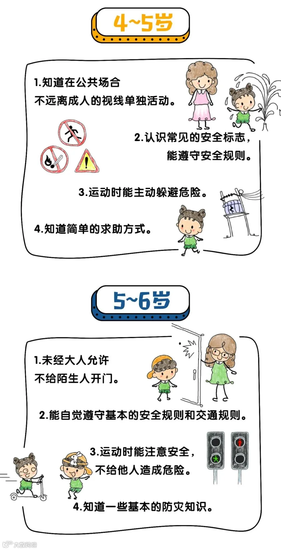 外出时,提醒幼儿要紧跟成人,不远离成人的视线,不跟陌生人走,不吃陌生人给的东西;不在河边和马路边玩耍;要遵守交通规则等。
