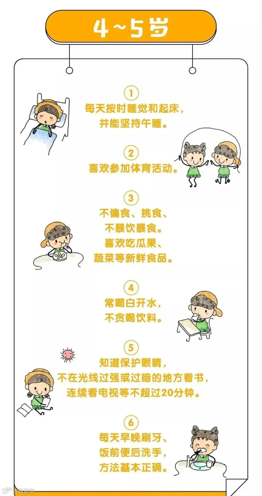 6.提醒幼儿保护五官,如不乱挖耳朵、鼻孔,看电视时保持3米左右的距离等。激发幼儿参加体育活动的兴趣,养成锻炼的习惯。如:
