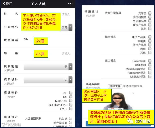 最近很多朋友反映说担心提交身份证信息会泄漏个人私隐,优享制造公众号把个人私隐的保护放在首位,各位上传的身份证信息在公众号上不会显示,只有公众号授权的管理员才在工程师审核时和认证时看得到身份信息,其他时间均不能看到工程师的身份证作息,请各位放心提交。