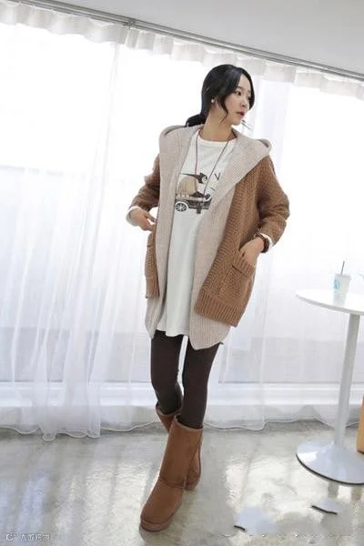 搭配示范:复古长款毛衣+黑色短裤+黑色打底裤+驼色雪地靴