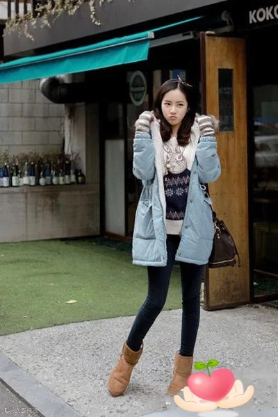 搭配示范:卡通印花毛衣+蓝色棉袄+牛仔铅笔裤+短款雪地靴