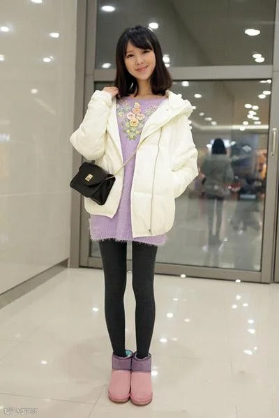 搭配要点:短款雪地靴露出脚踝,所以用打底裤、紧身裤、小脚裤搭配都会显得小腿纤细。由于露出了小腿,所以不太适合小腿中间缝隙大的妹子。