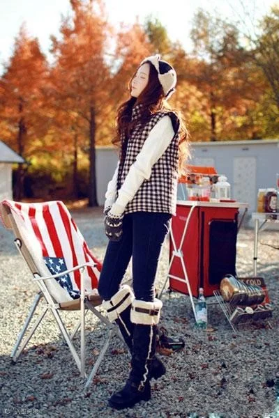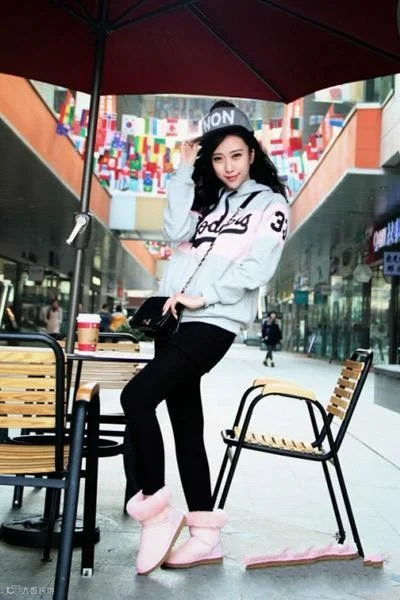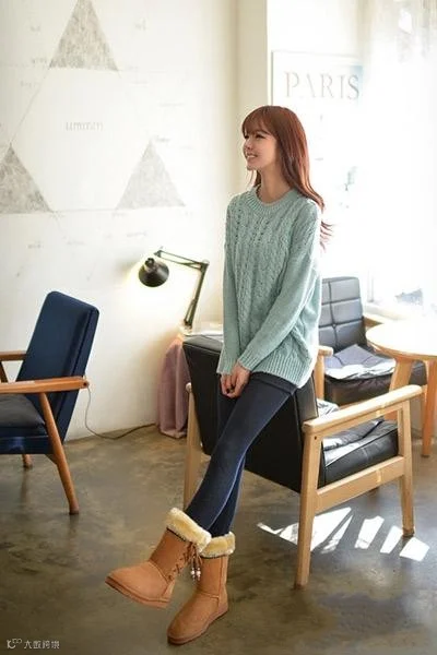 搭配要点:中长款雪地靴长度正好到小腿肚正下方,因此并不适合小腿肚上有肉的妹子。翻毛的设计会让腿部中间的间隙变得更小,所以能有效修饰O型腿的腿型,让腿部看上去更加笔直。